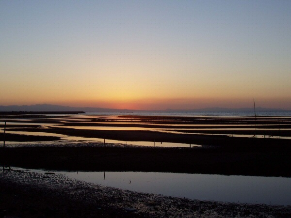 遠浅の海に砂州が縞模様に浮かび、キラキラと残照を反射させながら夕日が落ちていくさまは感激以外の何ものでもありません。