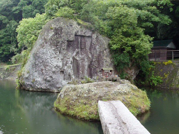 天念寺前の済んだ川面にどっしりと映る川中不動。水害を除く祈りが込められた不動三尊が